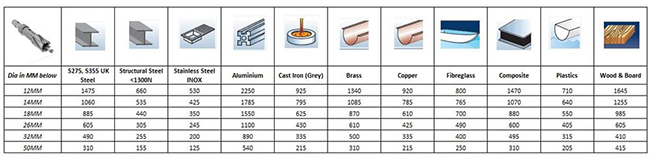 Rated for steel, structural steels, stainless steel (inox), Aluminium, Cast Iron, Brass, Copper, Fibreglass, composite and sandwich materials, plastics, and wood