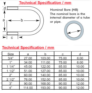 Extended leg nominal bore "u" bolts, mild steel, bright zinc plated.