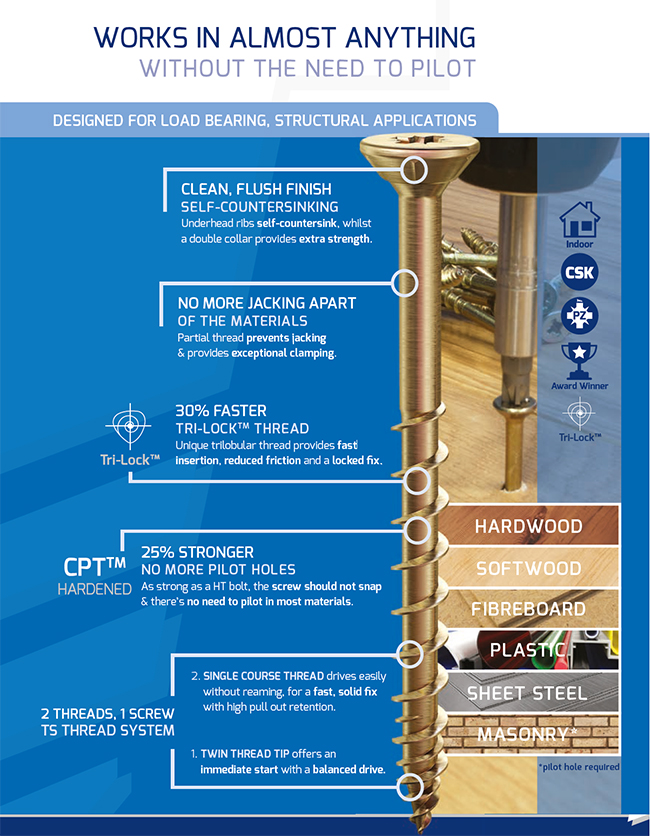 ‘Screw-Tite®’ extensively developed with the discerning craftsman/woman in mind, utilises the ‘Tri-Lock TS’ thread form which uniquely and cleverly incorporates the benefits of a single thread and a twin thread on the same screw, thus making it the most technically advanced screw available but more importantly the best performing woodscrew there is – a bold statement, we know, but we listened to what the user wanted and gave them just that.