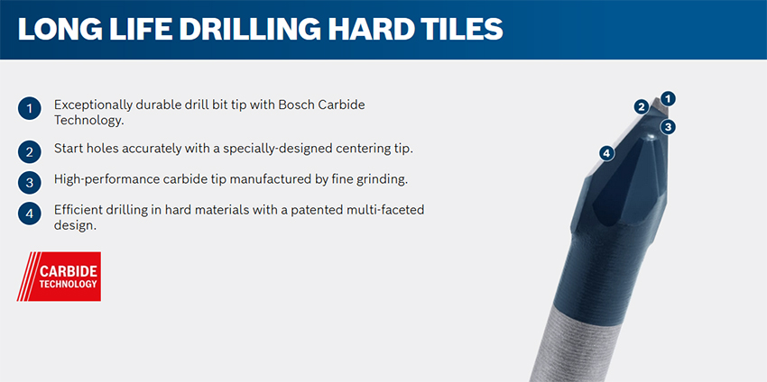 As wall tiles have become larger and harder, drilling holes in them has become very demanding on a tile drill bit. That’s why Bosch has developed the EXPERT Hard Ceramic Drill Bit, which is capable of dry-drilling hard ceramics and lasts far longer than standard drill bit for tiles.