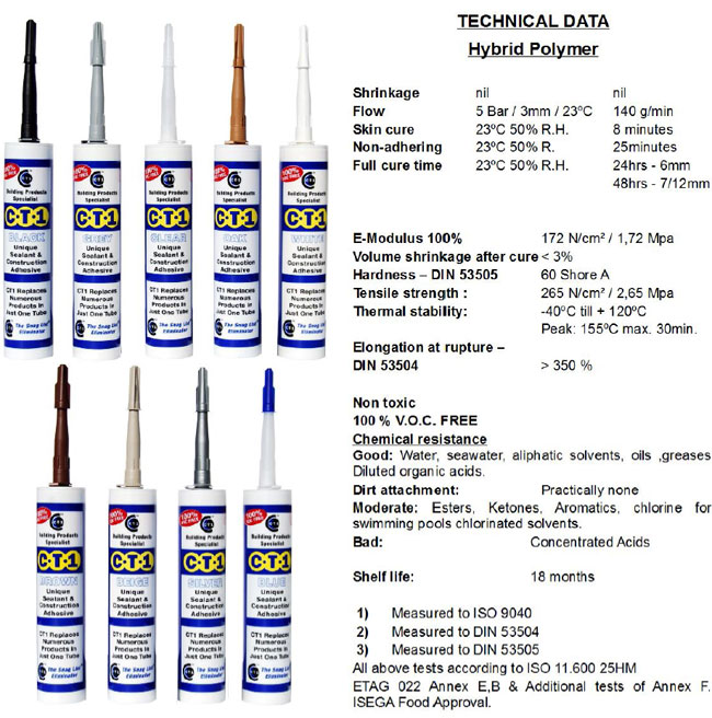 CT1 Unique all in one multi-purpose and waterproof hybrid polymer sealant & construction adhesive. Unique adhesion on virtually any material in most applications without the need for additional fixings. Can be used in damp or wet conditions, can even be gunned under water! (watch the video) Food safe - conforms to ISEGA Standards. Anti-fungal and has excellent resistance to chemicals.