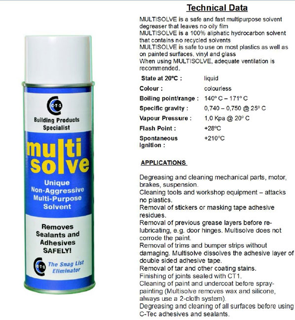 CT1 MultiSolve is a complete new multi-purpose solvent; for the safe removal of adhesives and sealants. Great for removal of chewing gum from all types of Furniture and materials such as, Upholstery, Wood, Formica, Plastic, Painted Metal and Canvas. (It is advisable to check for colour run on some fabrics). Multisolve is also very effective in deactivating and removing old silicones and adhesives, also tar, wax, ink, sticky labels and a multitude of stubborn deposits. See video and check out the CT1 MultiSolve in action!