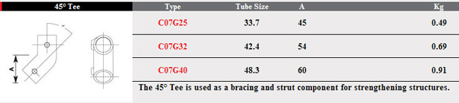 The 45 degree is used as a bracing and strut component for strengthening structures. This Fast Clamp 45 degree tee fitting should be used with size 6(G25) 33.7mm steel galvanised tubing.