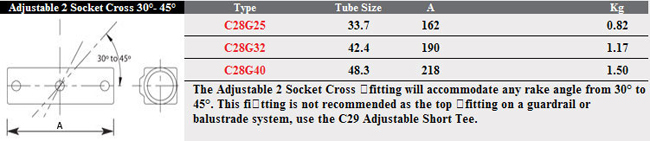 The Adjustable 2 Socket Cross fitting will accommodate any rake angle from 30 degrees to 45 degrees. This Fast Clamp fitting should be used with size 7(G32) 42.4mm steel galvanised tubing.