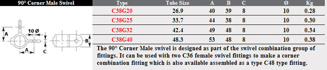 The 90 desgree Corner Male Swivel. It can be used with two C36 female swivel fittings to make a corner combination fitting. This Fast Clamp fitting should be used with size 7(G32) 42.4mm steel galvanised tubing.