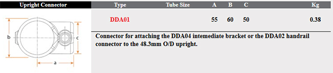 This bracket is used on uprights along with DDA-04 to attach onto tubing in the middle of a run or with DDA-02 for an end of run.