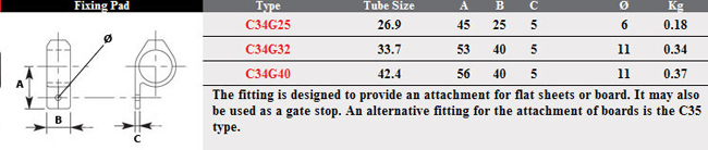 The fitting is designed to provide an attachment for flat sheets or board. It may also be used as a gate stop. This Fast Clamp fitting should be used with size 6(G25) 33.7mm steel galvanised tubing.