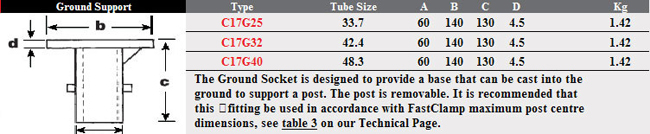 The Ground Socket is designed to provide a base that can be cast into the ground to support a post. This Fast Clamp fitting should be used with size 7(G32) 42.4mm steel galvanised tubing.