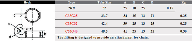 The fitting is designed to provide an attachment for chain & netting etc. This Fast Clamp fitting should be used with size 6(G25) 33.7mm steel galvanised tubing.