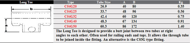The long tee is designed to provide a butt joint between two tubes at right angles to each other. Often used for railing ends & tops. It allows the through tube to be joined inside the fitting . An alternative is the C03G type fitting. This Fast Clamp Long tee fitting should be used with size 5(G20) 26.9mm steel galvanised tubing.