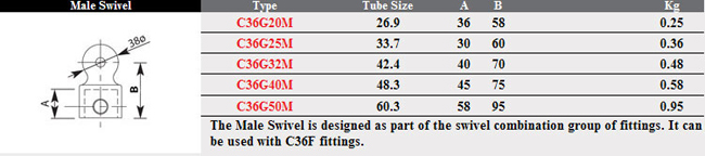 The Male Swivel is designed as part of the swivel combination group of fittings. It can be used with C36F fittings. This Fast Clamp fitting should be used with size 8(G40) 48.3mm steel galvanised tubing.