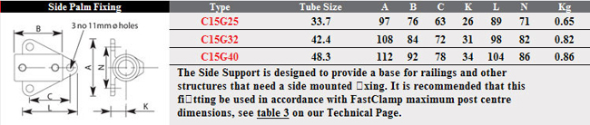 The side support is designed to provide a base for railing and other structures that need a side mounted fixing. It is recommended that this fitting be used in accordance with FastClamp maximum post centre dimensions. This Fast Clamp fitting should be used with size 7(G32) 42.4mm steel galvanised tubing.
