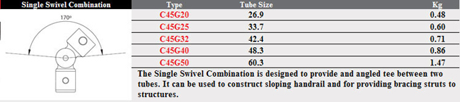 The singel swivel combination is designed to provide an angletee between two tubes. It can be used to construct sloping handrailand for providing bracing struts to structures. This Fast Clamp fitting should be used with size 8(G40) 48.3mm steel galvanised tubing.