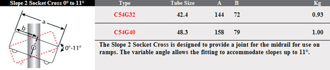 The slope 2 socket cross is designed to provide a joint for the midrail for use on ramps. the variable angle allows the fitting to accommodate slopes up to 11 degrees. This Fast Clamp fitting should be used with size 8(G40) 48.3mm steel galvanised tubing.