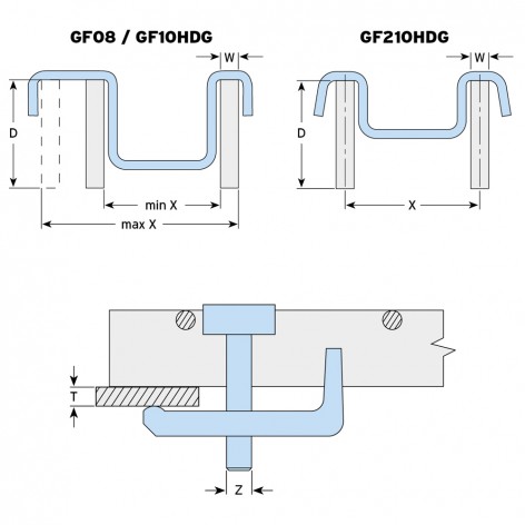 Type GF. Grating fixing for rectangular open bar grating with cast main body giving superior clamping force. Galvanised