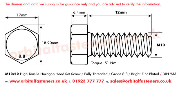 High quality - fully threaded - hexagon headed set screw. Made from high tensile steel grade 8.8 bright zinc plated. See technical information for line drawing dimensions.