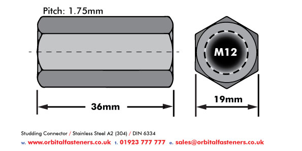 Used to connect two lengths of studding (threaded bar) Stainless steel. Threaded all the way through with the same across flats size as standard nuts. See technical information for line drawing dimensions.