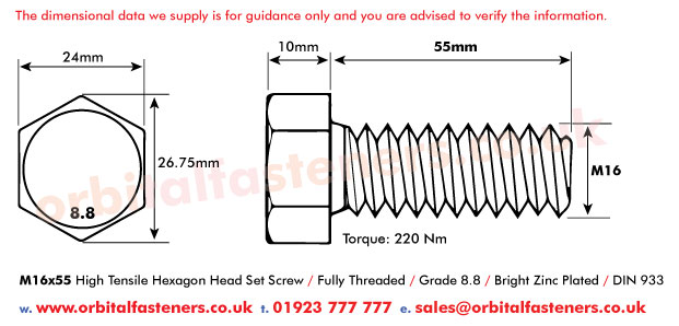 High quality - fully threaded - hexagon headed set screw. Made from high tensile steel grade 8.8 bright zinc plated. See technical information for line drawing dimensions.