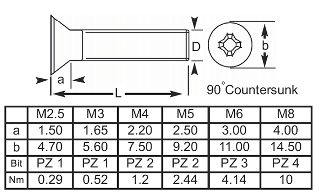 Countersunk Pozi Machine Screw. Bright Zinc Plated. Mild Steel. Grade 4.6. DIN 965