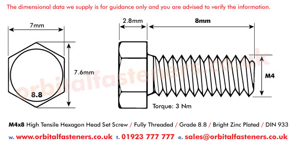 High quality - fully threaded - hexagon headed set screw. Made from high tensile steel grade 8.8 bright zinc plated. See technical information for line drawing dimensions.