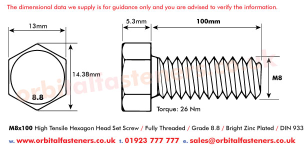 High quality - fully threaded - hexagon headed set screw. Made from high tensile steel grade 8.8 bright zinc plated. See technical information for line drawing dimensions.