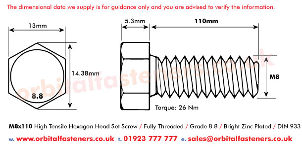 High quality - fully threaded - hexagon headed set screw. Made from high tensile steel grade 8.8 bright zinc plated. See technical information for line drawing dimensions.